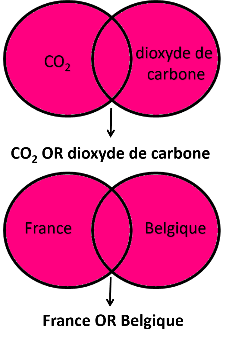 - Que fait-on des synonymes et termes proches des concepts ? Ils sont très importants car plus vous avez de termes par concept, plus vous trouverez des documents concernant votre sujet : au sein de chaque parenthèse, séparez donc les différents synonymes et termes proches par l’opérateur booléen « OR », signifiant « OU », pour chercher sur l’un ou l’autre ou plusieurs de ces termes.