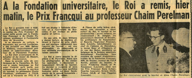 Professeur ordinaire à l'Université libre de Bruxelles depuis 1944, Perelman dirigeait le séminaire de philosophie depuis 1946, ainsi que le Centre national de Recherche de Logique. Il présida aussi la Société belge de Philosophie de 1955 à 1958 et la Faculté de Philosophie et Lettres de l'ULB de 1959 à 1962. C'est cependant en 1962 que la distinction scientifique suprême de la Belgique vint récompenser son inlassable activité de chercheur: la Fondation Francqui lui conféra, pour l'ensemble de ses travaux, le Prix Francqui, attribué pour la première fois à un philosophe. En 1958, Perelman avait en effet publié son œuvre majeure, le Traité de l'argumentation (Paris, 1958), qui sera traduit dans de nombreuses langues. Ce livre fut à l'origine d'un courant de pensée, la Nouvelle Rhétorique, qui aura une influence déterminante sur nombre de spécialistes des sciences humaines.Attribution du Prix Francqui 1962 à Chaïm Perelman.