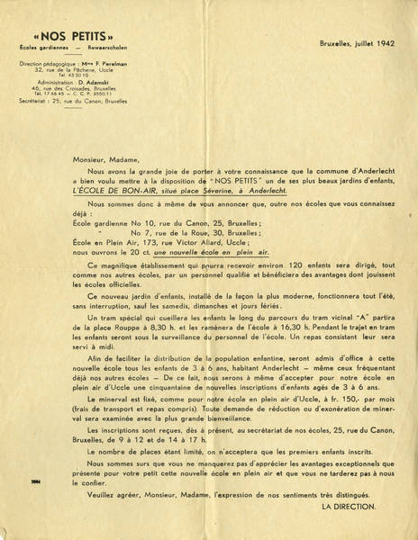 Lettre concernant les activités de l'école Nos Petits (juillet 1942).