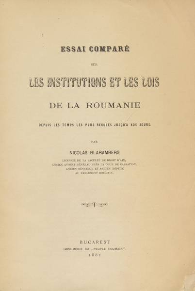 En écho au Festival Europalia Romania, la Digithèque de l’ULB met en lumière l’Essai comparé sur les institutions et les lois de la Roumanie depuis les temps les plus reculés jusqu'à nos jours que Nicolas de Moret de Blaramberg (1837-1896) publie en 1885 à l’enseigne de l’Imprimerie du « Peuple roumain », journal éponyme dont il est le fondateur.