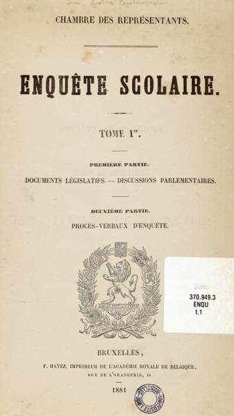 Les cinq tomes de l' « Enquête scolaire » regroupent l'ensemble des documents relatif à la polémique : une introduction explicative, les textes de lois et documents parlementaires sur les enquêtes, les procès verbaux d'auditions des témoins classés par cantons (bilingues pour les cantons de Flandre), le rapport final de la commission avec un historique des évènements ainsi que des annexes contenant des lettres pastorales, des tableaux statistiques et des cartes géographiques. Ces volumes forment un ensemble fondamental à l'étude de l'enseignement en Belgique mais aussi aux implications politiques, judiciaires, culturelles et religieuses de la guerre scolaire.
