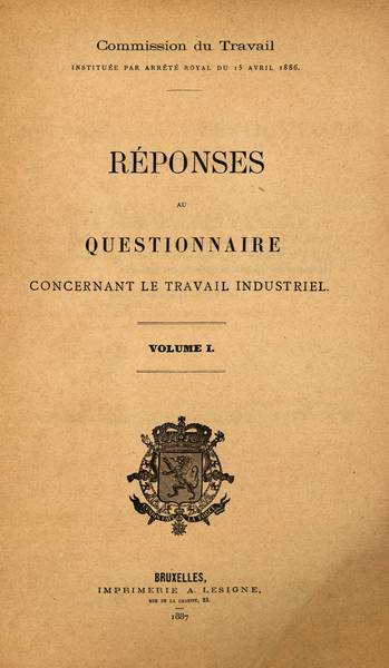 COMMISSION DU TRAVAIL, Comptes rendus des séances plénières. Mémoires, rapports, lettres, etc., envisageant la question ouvrière dans son ensemble, volume 4, Bruxelles : Lesigne, 1888. COMMISSION DU TRAVAIL, Procès-verbaux des séances d'enquête concernant le travail industriel, volume 2, Bruxelles : Lesigne, 1887. COMMISSION DU TRAVAIL, Rapports. Propositions des sections et conclusions, volume 3, Bruxelles : Lesigne, 1887. COMMISSION DU TRAVAIL, Réponses au questionnaire concernant le travail industriel, volume 1, Bruxelles : Lesigne, 1887.