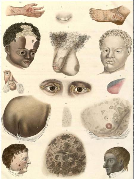 Mon service et surtout le Dispensaire de l’hôpital de la Charité, où se présentent une foule d’individus atteints de maladies chroniques, nous ont fourni un grand nombre de cas, parmi lesquels nous avons pu choisir des exemples caractéristiques des aspects variés que présentent les maladies cutanées dans leurs différentes périodes. Nous avons aussi représenté quelques maladies très rares, d’après des figures qu’en avaient données des auteurs estimés.